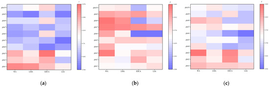 The value of p varies from 0.506 to 0.889. The overall value of the WA, LMA, EDCA and LSA methods was 0.797, 0.748, 0.702 and 0.704, respectively. The WA and LMA methods yielded the highest precision in plot 8. While the EDCA and LSA methods gave the highest precision in plot 7, which has the maximum density (2675 n/hm2) (Figure 5b). The lowest values of the four algorithms were obtained in plot 1, plot 2 and plot 6, which were low-density plots.