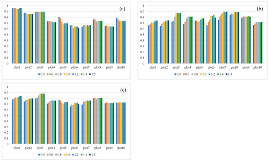 The accuracy of individual tree detection with seven smoothing factors of the WA method; (a) is the detection rate (r), (b) is the precision (p), (c) is the overall correctness (F).
