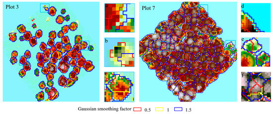 The canopy boundary was delineated more precisely when the smoothing factor is 1 in both low-density plot and high-density plot (Figure 7a,d). Either a smaller or larger factor value would have the effect of a shrinkage or expansion of the canopy boundary.