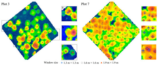 When the window size is 1.3 m × 1.3 m, it is capable of identifying more tree canopies and segmenting the canopy of dwarf trees in both low-density and high-density plots (Figure 9a,d). However, it is prone to result in over-segmentation (Figure 9c,f). On the contrary, it is not able to recognize as many tree canopies when the window size is 1.9 m × 1.9 m. And it is more likely to generate under-segmentation (Figure 9e). On the other side, if the tree canopies were overlapped, it can only recognize the extreme values of the canopy, which is also under-segmentation (Figure 9b).
