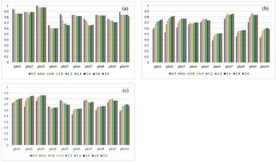 The detection rate r of all plots reaches the maximum value 1 when the spacing of the canopy vertex is set to 0.5 m and 0.6 m. As the distance thresholds increase, the detection rates (r) of individual trees decrease (Figure 10a), while when the spacing of canopy vertex increases to 1.2, the overall correctness (F) reaches the maximum value. And then, the overall correctness (F) stabilizes, although the spacing of canopy vertex increases (Figure 10c). The precision (p) increases as the distance thresholds increase in relatively lower density plots like plot 1, plot 2 and plot 3. But in higher density plots, like plot 5, plot 7 and plot 9, the p value increased first and then decreased as the distance thresholds increased.