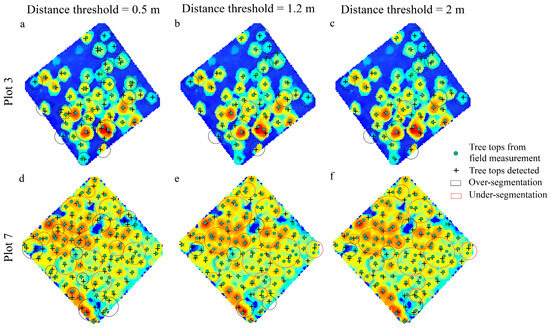 As the distance between the canopy vertices was getting smaller, more trees were detected, and it was easier to be over-segmented in both low-density and high-density plots (Figure 11). As the distance threshold increased, the number of trees detected decreased, and under-segmentation became evident (Figure 11c,f).