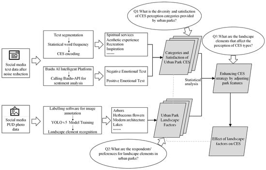 This study utilized social media data that combine text and images to correlate CESs with park landscape factors, conducting a perceptual assessment of CESs in urban parks. The research process consisted of the following four steps (Figure 2): (1) Extracting CESs from text using Natural Language Processing (NLP): Jieba 0.42.1 was applied to preprocessed text data to obtain word frequency statistics, and a professional team was employed for coding and constructing a CES perception information lexicon. (2) Using machine learning to identify landscape factors in photos: the YOLO v5 model was trained to extract landscape factors from preprocessed image data and construct a landscape factor perception system. (3) Correlation analysis: SPSS software and IBM SPSS Modeler software were used to conduct an internal correlation analysis of CES categories and a corresponding analysis with landscape factors. (4) IPA evaluation of CESs: using the Baidu AI intelligent platform to conduct a sentiment analysis on text data, visitor satisfaction with CESs was calculated and combined with CES coding statistics (importance) to construct an IPA evaluation structure.