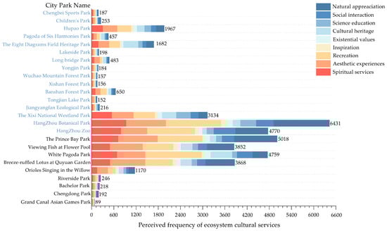 Figure 4 presents the CES frequencies in different types of parks. The comprehensive parks had a total of 7585 text records and 19,412 CES code records documenting visitors’ perceptions of CESs. Among them, Prince Bay Park and White Pagoda Park had the highest frequency of perception keywords, accounting for 25.85% and 24.52%, respectively. In the 7152 perception records of specialized parks, there were 21,077 CES code entries, with zoos (n = 4770, 22.63%) and botanical gardens (n = 6431, 30.51%) showing a significant advantage in the quantity of perceived CES code entries. According to Figure 5, the aesthetic experience function of Tongjian Lake Park and the leisure and recreation function of White Pagoda Park had the highest proportions among all CESs in their respective parks, accounting for 38.16% and 32.04%, respectively. Spiritual services and natural appreciation had average ratios of 12.99% and 14.69%, respectively, ranking only behind aesthetic experience and recreation. The differences in historical and cultural perceptions among the different parks were substantial, with the highest being in the Eight Diagrams Field Heritage Park at 23.96% and the lowest in Hangzhou Zoo at 2.54%. Social interaction was prominent in Children’s Park and Hangzhou Zoo, accounting for 17.00% and 12.29%, respectively. These data indicated that the public prefers social activities in these two parks. Among all the parks, only a few visitors perceived inspiration, existential values, or science education (all below 6.20%), with inspiration having the lowest perception frequency.