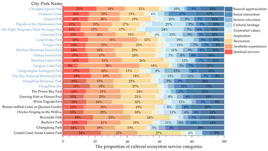 The gender ratio of the visitors in the 25 urban parks was 2.26:1, with 57.64% of the visitors being from outside the province and 42.34% from within the province. Out of 17,266 text data points, we counted 7371 words with a frequency greater than six, which were counted and encoded as 985 words as CES perception information. Approximately 14,737 texts reflected visitors’ perceptions of CESs, accounting for 85.35%. The overall perception frequency of CESs was above 80.00%, with 13 parks having a perception frequency exceeding 90.00%, accounting for 52.00%. All CES categories were perceived in the various parks, but there are differences among different parks (as shown in Figure 4). The perception frequencies of spiritual services, aesthetic experiences, recreation, and natural appreciation were significantly prominent. Aesthetic experience and recreation had relatively even distribution ratios in the various parks, around 19.00% (Figure 5).