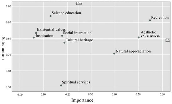 3.1.2. Importance–Performance Analysis of Visitors at Urban Park CESs