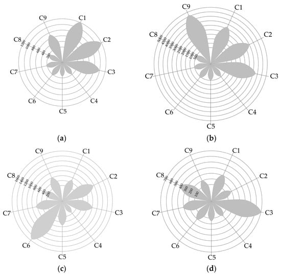 Heterogeneity of CES categories under landscape categories. (a) Hydrological landscape; (b) biological landscape; (c) architecture landscape; (d) facility landscape; C1: spiritual services; C2: aesthetic experiences; C3: recreation; C4: inspiration; C5: eexistential values; C6: cultural heritage; C7: science education; C8: social interaction; C9: natural appreciation.
