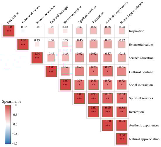 Correlation between categories of cultural ecosystem services. Note: ***, p < 0.001; **, p < 0.01; *, p < 0.05.