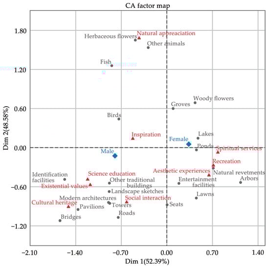 The MCA diagram shows the positions of CESs (red font), landscape factors (gray font), and visitor gender (blue font) in the first two-dimensional factor plan.