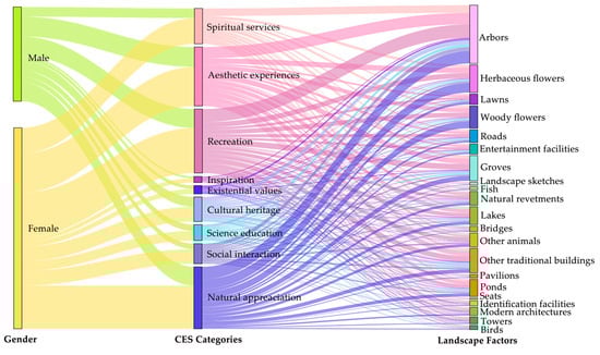 The author created a Sankey diagram to visually represent each CES category’s perceptual flow. As shown in Figure 10, females contributed significantly to the perception of all the CES categories, enhancing the perceptions of spiritual services, aesthetic experiences, and recreation for all landscape factors, particularly arbors and herbaceous flowers, fish, landscape sketches, and seats, which had the lowest contribution rates to the perceptions of the remaining six CES categories.
