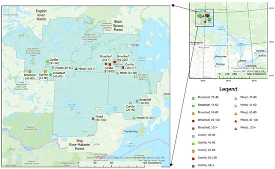 LiDAR and model validation data were collected in 15 natural, wildfire-origin stands that represented five age classes (20–40 years, 41–60 years, 61–80 years, 81–100 years, and 101+ years) and three species groups (broadleaf-dominated sites (BRD): 68%–100% broadleaf, coniferous sites (CON): 68%–100% conifer, and mixed sites (MX): 33%–67% conifer). The study sites were located in one of three forest management units (FMUs) that adjoined each other: the Black Spruce, Dog River–Matawin, and English River FMUs. The sites sampled represented a selected subsample of the Ontario Ministry of Natural Resources and Forestry (OMNRF) Vegetation Sampling Network (VSN) plots. VSN plots are circular (400 m2), with a radius of 11.28 m from a fixed plot center to the plot boundary. All VSN plot centers are marked on the ground with a metal rod to ensure each field crew visiting the site uses the same plot center. Below, Figure 1 shows the location of the sites selected for this study within northwestern Ontario, as well as their location within Ontario.