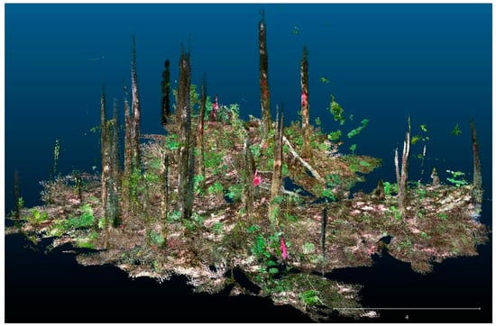 To prepare sites for LiDAR acquisition, the metal rod at the plot center was flagged with both pink and yellow flagging tape. The 5 m radius from plot center to the LiDAR subplot boundary in each of the four cardinal directions was measured using a 30 m measuring tape. Tripods were placed at the plot boundary in each of the four cardinal directions to simplify the process of point cloud registration and point matching. The base of all measured, living trees located in each plot were marked with pink flagging tape to facilitate identification of ‘in’ trees while acquiring LiDAR data. Point clouds were acquired using the Zappcha application (v6.1; Vessus, St. Leonards-on-Sea, East Sussex, England) and an Apple iPad Pro 12th Generation [,]. The circular scanning method that was found to provide the most accurate estimates of DBH was used for point cloud acquisition []. Below, Figure 2 shows the raw point cloud for site BRD 61–80.