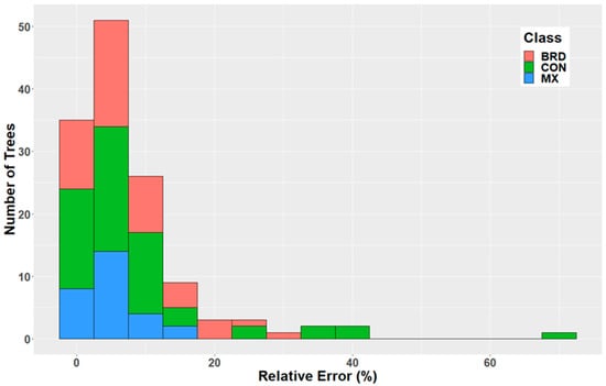 As highlighted in Figure 4, the data did not follow a normal distribution. The skewness was 3.17 with a Kurtosis value of 16.56, indicating a highly skewed dataset. To determine if any of the above factors had statistically significant impacts on the accuracy of DBH estimates (relative MAE; %), Kruskal–Wallis tests were used, as this test accounts for the abnormal distribution of the results data []. Age class and density had large magnitudes of effect on the relative accuracy of the estimated DBH values for individual trees (Table 4). Understory classes had a moderate magnitude of effect, while species class had a small effect on the accuracy of estimated DBH values. Age (0.17) and understory classes (0.13) had the greatest effect sizes when examined individually, as well as when examining pairwise interactions (0.23). Species class (0.01) had the smallest effect size on the relative accuracy of estimated DBH values.