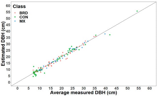 Below, Figure 5 shows a scatter plot of the estimated DBH (cm) for each individual tree (coloured by site species class), plotted as a function of measured DBH (cm), with a line plotted showing a 1:1 relationship (i.e., y = x).