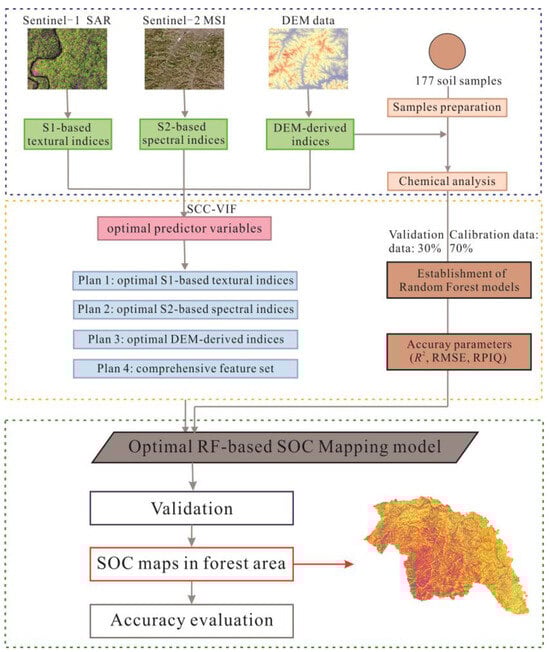 Flowchart for mapping the soil organic carbon (SOC) content of forested area using Sentinel-1/2 and DEM data and the random forest algorithm.