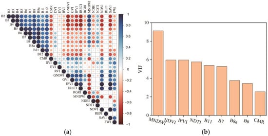 The variance inflation factor (VIF) value of the S2-based spectral indices screened by Spearman correlation coefficient (SCC). (a) Heat map of the SCC; and (b) VIF values of the S2-based spectral indices selected by the SCC.