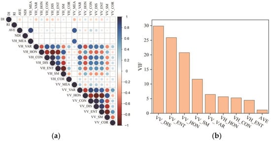 The variance inflation factor (VIF) value of the S1-based textural indices screened by Spearman correlation coefficient (SCC). (a) Heat map of the SCC; and (b) VIF values of the S2-based textural indices selected by the SCC.