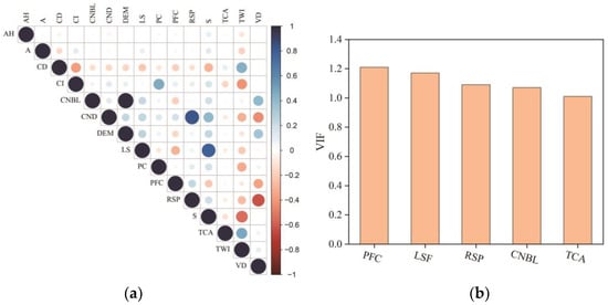 The variance inflation factor (VIF) value of the DEM-derived indices screened by Spearman correlation coefficient (SCC). (a) Heat map of the SCC; and (b) VIF values of the DEM-derived indices selected by the SCC.