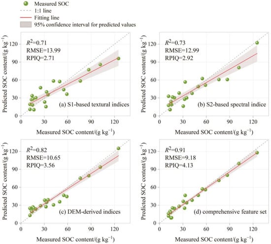 Scatter plots of measured versus predicted SOC contents of the models constructed with the (a) S1-based textural indices; (b) S2-based spectral indices; (c) DEM-derived indices; and (d) comprehensive feature set.