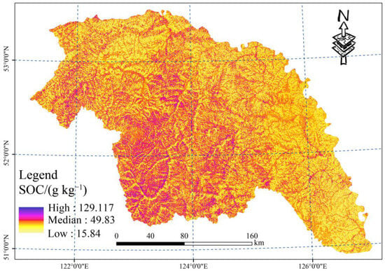 We applied the optimal model to the full research region to assess model’s generalization ability. The SOC content in the Greater Khingan Mountains is shown in Figure 8.