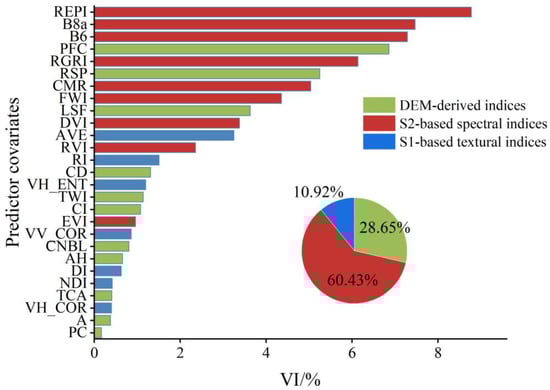 In the SOC mapping models, the S2-based spectral indices were the most important, followed by the DEM-derived and S1-based textural indices. The S2-based spectral indices, S1-based textural indices, and DEM-derived indices accounted for 60.44%, 10.92%, and 28.65% of the total, respectively (Figure 9).