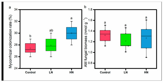 Mycorrhizal colonization rate (a) and AM fungal biomass (16:1ω5, (b)) under different N addition treatments. Control, no N addition; LN, 40.0 kg ha−1 yr−1; HN, 80.0 kg ha−1 yr−1. Different letters above the bars indicate significant differences (p < 0.05).