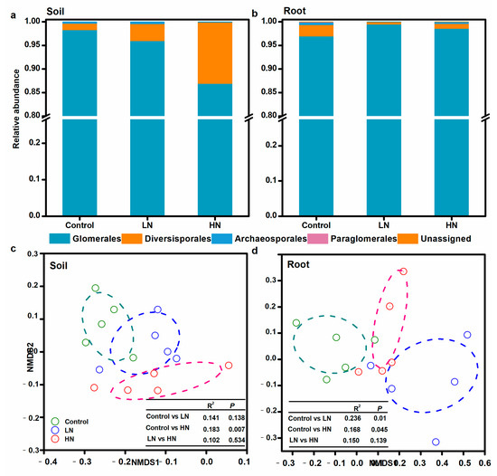 Taxonomic composition of the AM fungal community at the order level under different treatments in soil (a) and roots (b). Nonmetric multidimensional scaling (NMDS) plots of AM fungal community dissimilarities among different treatments in soil (c) and roots (d).