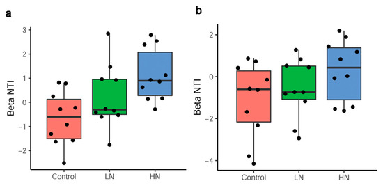 The beta NTI of soil and root AM fungi was analyzed to explore the relative contribution of stochasticity and determinism in driving the AM fungal community assembly. Most beta NTI values for soil AM fungi ranged from −2 to +2 in all treatments, and were greater in N addition treatments, especially in the HN treatment (Figure 6a). For root AM fungi, the beta NTI changed from lower than −2 in the control to between −2 and +2 under N addition treatments. There was a higher beta NTI in the N treatment; the contribution of stochasticity decreased and determinism increased in N plots (Figure 6b).