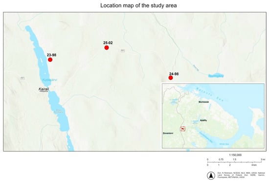 Location map of the study plots: 23-98—lichen-green moss-shrub pine forest, 25-02—lichen-shrub pine forest, 24-98—dwarf shrub-green moss spruce forest.