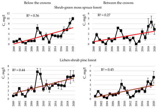 Long-term dynamics of carbon concentrations in the atmospheric precipitation in pine and spruce forests demonstrated significant variability, both below and between the crowns. In the rainwater below the crowns in the lichen-green moss-shrub pine forest, a trend (R2 = 0.78) was found in 1999–2009 of decreasing carbon concentrations—from 77 to 61 mg/L. In 2013–2020, in the rainwater in the treeless area, a trend (R2 = 0.83) was found for increasing carbon concentrations—from 3.2 to 5.52 mg/L. In snow, in recent years, there was a trend of increasing carbon concentrations in the treeless area, as well as below the crowns in the dwarf shrub-green moss spruce forest and both below and between the crowns in the lichen-shrub pine forest (Figure 2). An increase in carbon concentrations in snow, clearly observable below the crowns, may be associated with an increase in the number of thaw days in the Murmansk region over the period 2000–2012 [].