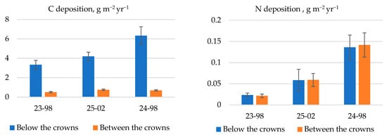 Carbon deposition with snow below and between the crowns does not differ significantly, despite the 1.2–1.3 times higher precipitation between the crowns. Below the crowns of spruce forests, the average annual carbon deposition for the period from 1999 to 2020 was 0.09 g m−2 yr−1, between the crowns, 0.07 g m−2 yr−1, and in pine forests, 0.07 and 0.06 g m−2 yr−1, respectively. Carbon deposition by rain in spruce and pine forests was significantly higher below the crowns than between the crowns; the amount of precipitation between the crowns was significantly (up to two times) higher than below the crowns. In spruce forests, carbon deposition below the crowns and nitrogen deposition between and below the crowns was higher than in pine forests (Figure 3).