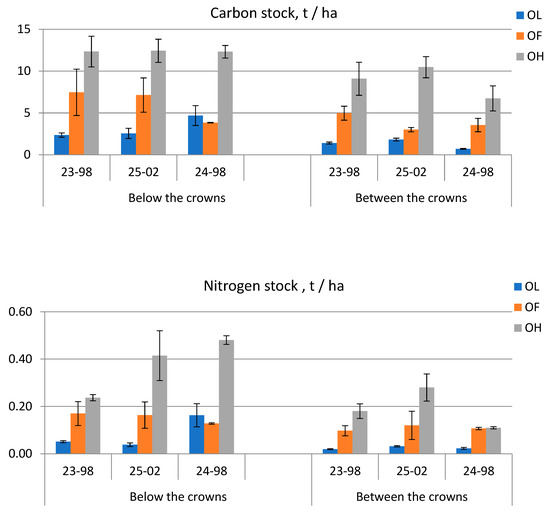 Carbon and nitrogen stocks in the soils of northern taiga forests showed intrabiogeocoenotic differences. The bulk of soil carbon and nitrogen was concentrated below the crowns and varied from 2 to 18 t/ha and 0.015 to 0.624 t/ha, respectively. The lowest carbon and nitrogen stocks were found in the OL horizon, and the highest were found in the OH horizon (Figure 4).