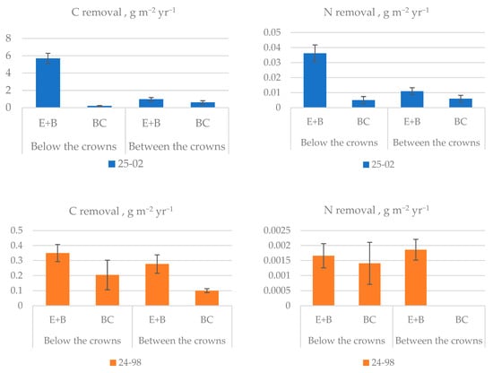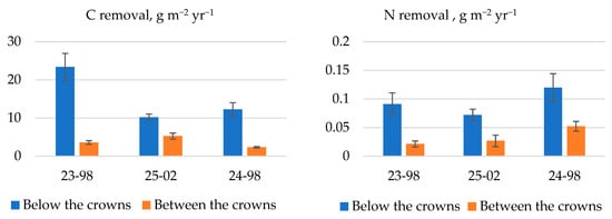 The average annual removal of carbon and nitrogen with water from the organic and mineral soil horizons in 1999–2020 below the crowns in the spruce and pine forests is significantly higher than that between the crowns (Figure 6). The average annual carbon removal with water from mineral soil horizons for the period from 1999 to 2020 below the crowns in the spruce is higher than that between crowns; nitrogen removal with water has no pronounced intrabiogeocenotic differences (Figure 7). In pine forests, carbon and nitrogen removal in water of eluvial soil horizons below the crowns is significantly higher than between the crowns; in water from mineral soil horizons, carbon and nitrogen removal does not have pronounced intrabiogeocenotic differences.