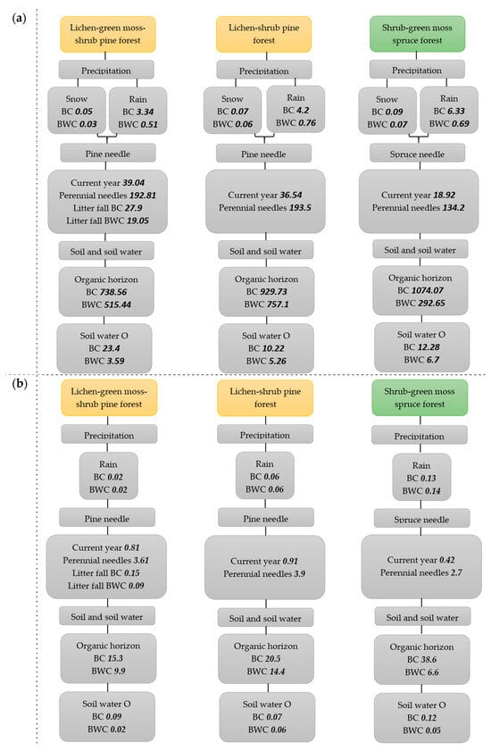 Carbon (a) and nitrogen (b) content in different components in northern taiga forest ecosystems, g m−2 (for atmospheric and soil water g m−2 yr−1), averaged over the period from 1999 to 2020. BC—below crowns, BWC—between crowns.
