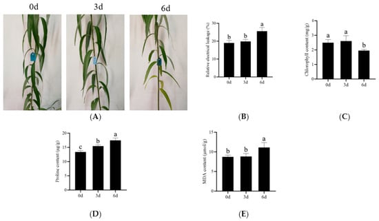 Phenotype (A) and physiological performance (B–E) of S. matsudana Koidz 9901 under salt treatments for 0 d, 3 d, and 6 d. The different letters in columns (B–E) indicate the significant differences at the level of p < 0.05 according to the LSD test (SPSS 24.0).
