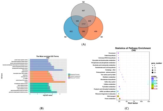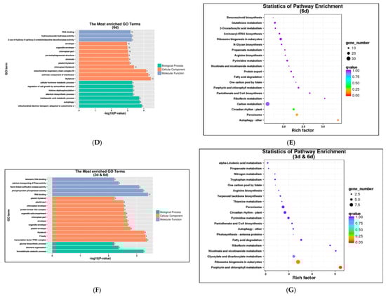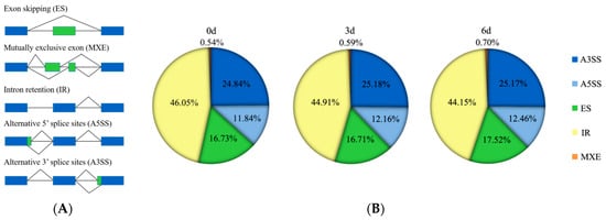 Comparing DEGs with DAS genes, fewer genes were shared. For instance, 142 shared genes were found at 0 d vs. 3 d, accounting for 12.24% of the 1160 DEGs and 7.53% of the 1886 DAS genes. Meanwhile, 264 shared genes were found at 0 d vs. 6 d, accounting for 11.32% of the 2332 DEGs and 11.89% of the 2221 DAS genes. Fifty-two shared genes were found at 3 d vs. 6 d, accounting for 8.58% of 606 DEGs and 2.56% of 2031 DAS genes (Figure 7A).