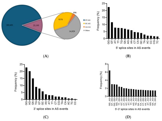 AS events in plants are categorized into four types, namely exon skipping (ES), intron retention (IR), alternative 5′ splicing site (A5SS), and alternative 3′ splicing site (A3SS) []. A survey on Populus tomentosa Carr under regular conditions showed that 44.72% of the AS events were of the IR type, and 26.14%, 19.60%, and 9.54% of the AS events were of the A5SS, A3SS, and ES types, respectively. Even the ratio of the four AS types varied during heat treatment [].