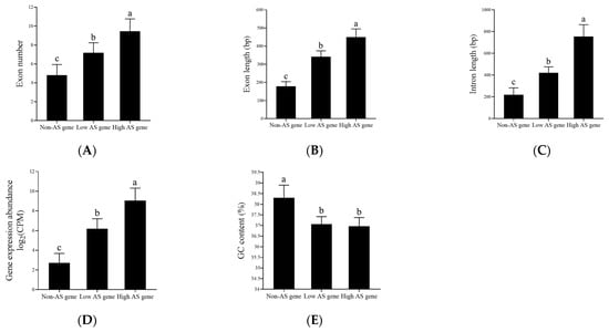 Multiple comparisons among high-AS genes, low-AS genes, and non-AS genes in the number of exons (A), length of exons (B), length of introns (C), gene expression abundance (D), and GC content (E). Error bar means standard deviation. The different letters indicate significant differences at the level of p < 0.05.