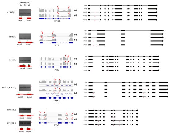AS events of five genes during salt stress. The left section shows RT–PCR results; the red star denotes the alternative splice form. The schematic figure is below each gel image, with the block indicating an exon, the line representing an intron, and the pink block representing an A3SS event. The green arrows indicate primer locations for AS events. The middle section presents the visualization of the transcriptome results via the IGV browser; the grey peaks indicate the RNA-seq read density across the gene. The red arrows represent alternative splice sites. The blue arcs indicate splice junctions. The relative gene structure is given below each panel. The right section illustrates the diagram of AS events at 0 d, 3 d, and 6 d of salt treatment based on RNA-seq data; the red star represents the AS events that occurred.