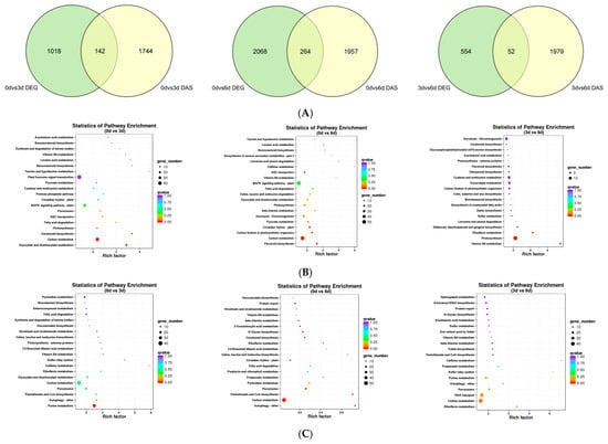 Comparison between DAS genes and DEGs during salt stress: (A) Venn plots of DEGs and DAS genes at 0 d vs. 3 d, 0 d vs. 6 d, and 3 d vs. 6 d; (B) KEGG enrichment pathway of DEGs at 0 d vs. 3 d, 0 d vs. 6 d, and 3 d vs. 6 d; (C) KEGG enrichment pathway of DAS genes at 0 d vs. 3 d, 0 d vs. 6 d, and 3 d vs. 6 d.