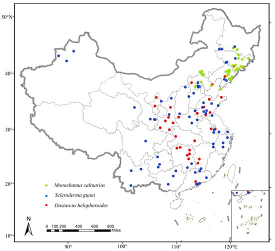 Geographical distribution of Monochamus saltuarius, Scleroderma guani, and Dastarcus helophoroides in China after collection and screening.