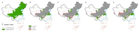 Potential distribution of Monochamus saltuarius. Potential distribution in the current climate is depicted in the map below, with green indicating a suitable habitat for growth (A). Extrapolating from the current climate to the future (2021–2040), the scenarios SSP1-2.6 (B), SSP2-4.5 (C), SSP3-7.0 (D), and SSP5-8.5 (E) were considered. Green indicates areas in the potential distribution that will disappear in the future. Gray indicates areas where the potential distribution will not change in the future. Pink indicates new potential distribution areas.