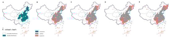 Potential distribution changes in research species in China under current and future climate scenarios (2021–2040).