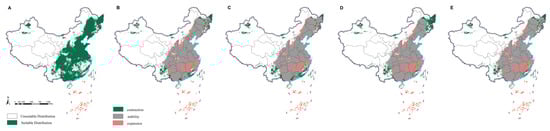 Potential distribution range of Dastarcus helophoroides. Predictions for the current climate are depicted in the map below, with green indicating the suitable habitat for growth (A). Extrapolating from the current climate to the future (2021–2040), the scenarios SSP1-2.6 (B), SSP2-4.5 (C), SSP3-7.0 (D), and SSP5-8.5 (E) were considered. The interpretation of colors is the same as that in Figure 1.