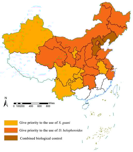 In contrast to the longhorn beetle, the future increase in temperature is expected to facilitate colonization by natural parasitoids. The future distributions of D. helophoroides and S. guani are projected to increase. In a previous study, the symbiotic period between M. saltuarius alone with D. helophoroides lasted from April to August (approximately 5 months) []. The mortality rate of M. saltuarius was 74.15% after the release of D. helophoroides in the forest, indicating that a preliminary control effect was achieved. The highest corrected mortality of M. saltuarius larvae was 95.65%, while the corrected mortality of M. saltuarius larvae in the forest was 39.20% []. In a study in which D. helophoroides and S. guani were applied to M. alternatus, the combined release of both species showed a more significant control efficacy than those of each species separately []. The combined control of M. saltuarius by S. guani and D. helophoroides has not been reported to date. By comparing the AOI values of “M. saltuarius + D. heliophoroides” and “M. saltuarius + S. guani” in each province. We prioritize natural enemy insects based on the combination with the highest value. When the two quantities are equal, they are used together, as depicted in Figure 5. The results of this study (Figure 5) indicate that S. guani can be used for nationwide large-scale biological control. Release should be prioritized in seven provinces (Xinjiang, Sichuan, Yunnan, Guizhou, Chongqing, Anhui, and Ningxia). D. helophoroides is more suitable for north China, northeast China, central China, and some northwest and coastal areas, including Beijing, Inner Mongolia, Shanxi, Heilongjiang, Jilin, Shaanxi, Gansu, Qinghai, Hebei, Hubei, Hunan, Shandong, Jiangsu, and Zhejiang. In addition, the provinces of Liaoning, Hebei, and Tianjin should prioritize the use of the combination.