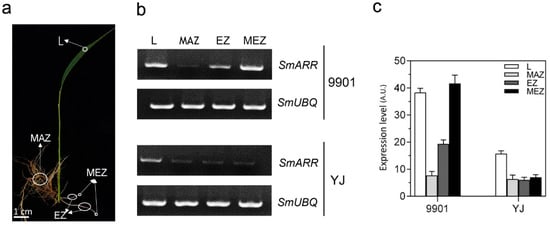 Expression profile of SmRR5 in the willow variety 9901 and YJ. (a) Schematic drawing of the 9901 leaves (L), root maturation zone (MAZ), root elongation zone (EZ), and root meristem zone (MEZ); (b,c), PCR results and quantification data of SmRR5 in different tissues.