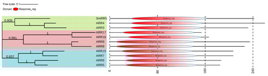 Phylogenetic relationship and gene structure analysis of SmRR5 and Arabidopsis RRA genes.