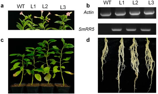 Performance of SmRR5 transgenic tobacco lines (L1–L3) and wild-type plants (WT). (a,c,d): flowering, plant height, and root phenotype of transgenic and WT lines. (b) PCR results of SmRR5 with the cDNA samples of tobacco seedlings with actin as the reference gene.