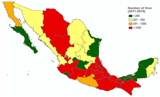 We analyzed fire suppression records from CONAFOR [64] from 2011 to 2015 for every state of Mexico. The database contains the start and end date of each fire, based on fire suppression records, their coordinates, and the corresponding state of Mexico. The total number of fire suppression records in the study period was 38,715. The states with a higher number of fire records included State of Mexico, Chihuahua, Durango, Michoacan, Ciudad de Mexico, Jalisco, Puebla, Chiapas, and Oaxaca, with more than 1000 fire suppression records for the study period (Figure 1). Conversely, the states with the lower number of fire registers were Aguascalientes, Baja California Sur, Colima, Campeche, Guanajuato, Tamaulipas, Tabasco, and Yucatan (Figure 1).
