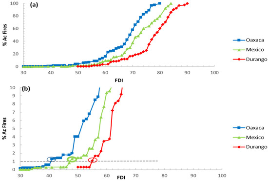 Accumulated percentage of fires (% Ac Fires) against Fuel Dryness Index (FDI) values for the states of Oaxaca (blue), Durango (red), and State of Mexico (green) (a) and detail of the same curves for the % Ac Fires below 10% (b). FDI99 values (FDI values corresponding to a % Ac Fires of 1) are marked as circles for each curve.